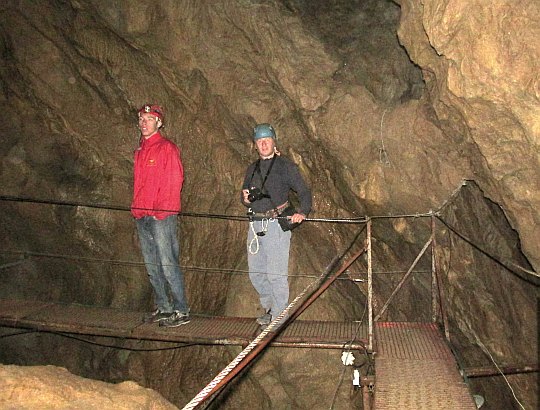 Po krótkim szkoleniu o godzinie 15.20 schodzimy do jaskini prowadzeni przez przewodnika, w towarzystwie trzech sympatycznych słowackich turystek. Penetrujemy ciemne korytarze jaskini poruszając się podstawową trasą "A". Na pozostałe trasy braknie nam już czasu. Wrócimy jednak tu na pewno, a wcześniej zarezerwujemy sobie termin podziemnej wędrówki. Ze Słowaczkami umawiamy się, że spotkamy się tu już za rok, tego samego dnia ;)