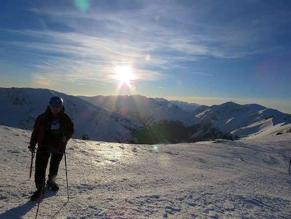 Zatrzymujemy się na krótko w restauracji na herbatę i o dziesiątej ruszamy dalej. Narciarze mają dzisiaj raj, nawet poza weekendem jest tutaj całkiem sporo ludzi, nie tylko sympatyków narciarstwa, ale chętnych spojrzeć z centrum na Tatry, bo Kasprowy Wierch leży niemal w samym środku Tatr. Przy dogodnych warunkach atmosferycznych oferuje świetną, dookólną panoramę. Od razu jednak kierujemy się na Suchą Przełęcz, a z niej łagodnym podejściem zdobywamy Beskid. Szlak na ten wierzchołek jest jak zwykle zatłoczony, choć nie tak bardzo, jak w ostatnią sobotę. Prowadzi na niego wygodna, szeroka droga. Zdobycie tego dwutysięcznika (liczy sobie 2012 m n.p.m. wysokości) nie jest problemem, nawet dla osób nie wprawionych w turystyce tatrzańskiej. Za Beskidem nie jest już tak łatwo. Zejście na przełęcz Liliowe prowadzi po stromym stoku, poszarpanym skałami wystającymi spod śniegu. Śniegu jest stosunkowo niedużo. Mamy w pamięci nie tak dawne intensywne opady śniegu i odcięte od świata schroniska. Ciepła aura jednak uczyniła swoje. Śnieg chrupie pod rakami - jest zmrożony, ale jego warstwa na grzbiecie nie jest bardzo duża. Wystają spod niego skały, jak też końce kosodrzewiny. Omijamy Liliową Kopkę. Przełęcz Liliowe (słow. Ľaliové sedlo; 1952 m n.p.m.) przechodzimy o godzinie 10.10. Stanowi ona granicę między Tatrami Zachodnimi i Tatrami Wysokimi, do których teraz wchodzimy.